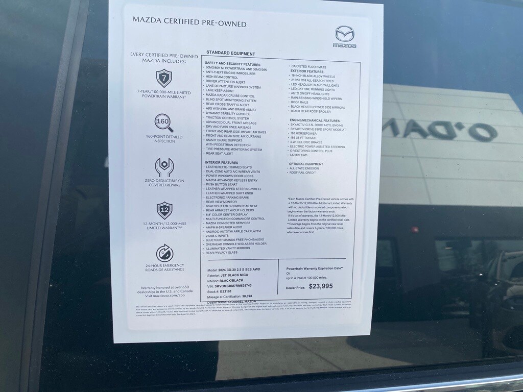 Certification Program Details: Only the Best-Maintained late-model vehicles make the Mazda Certified Pre-Owned (CPO) make the cut. To be eligible, vehicle must pass a 160 point rigorous inspection from major to minor components each vehicle is scrutinized and tested. Mazda CPO'S will also include: *12 month/12,000 miles CPO limited warranty * 7year/100,000 mile limited powertrain warranty * Zero Deductible on covered repairs * 24 hour emergency road side assistance * 3-month complimentary Sirius XM radio Trial