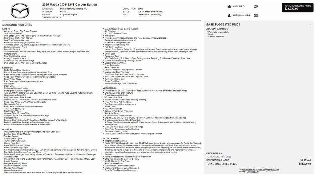 1 Owner, CX-5 2.5 S Carbon Edition, AWD, AppLink/Apple CarPlay and Android Auto, Auto High-beam Headlights, Exterior Parking Camera Rear, Heated front seats, Leather Seat Trim, Memory seat, Power driver seat, Power Liftgate, Power moonroof, Rain sensing wipers, Wheels: 19" x 7J Aluminum Alloy.