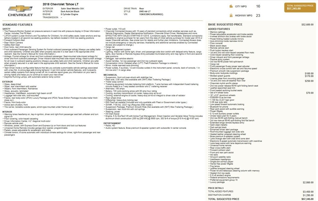 Local Trade in, Tahoe LT, EcoTec3 5.3L V8, 1st & 2nd Row Color-Keyed Carpeted Floor Mats, 2nd Row 60/40 Split-Folding Manual Bench, 2nd Row Pwr Release 60/40 Split Folding Bench Seat, 3rd Row 60/40 Power Fold Split-Bench, 3rd Row Manual 60/40 Split-Folding Fold Flat Bench, 4-Wheel Antilock Disc Brakes w/Brake Assist, 5 12-Volt Auxiliary Power Outlets, Adjustable pedals, Alloy wheels, Apple CarPlay/Android Auto, Auto High-beam Headlights, Auto-Dimming Inside Rear-View Mirror, Black Assist Steps, Bose Premium 9-Speaker System, Cargo Net, Color-Keyed Carpeting Floor Covering, Driver Inboard & Front Passenger Airbags, Electronic Cruise Control w/Set & Resume Speed, Enhanced Driver Alert Package (Y86), Extended-Range Remote Keyless Entry, Exterior Parking Camera Rear, Floor Console, Fog Lamps, Forward Collision Alert, Front & Rear Park Assist, Front Heated Reclining Bucket Seats, Front Passenger 6-Way Power Seat Adjuster, Hands Free Power Liftgate, Heated 2nd Row Seats, Heated Leather Wrapped Steering Wheel, IntelliBeam Headlamps, Lane Change Alert w/Side Blind Zone Alert, Lane Keep Assist w/Lane Departure Warning, Leather-Appointed Seat Trim, Leather-Wrapped Steering Wheel, Low Speed Forward Automatic Braking, Luxury Package, Memory Settings, OnStar Basic Plan For 5 Years, Passive Entry System, Power Liftgate, Power Tilt & Telescopic Steering Column w/Memory, Power-Adjustable Accelerator & Brake Pedals, Power-Folding Heated Outside Mirrors, Preferred Equipment Group 1LT, Premium Smooth Ride Suspension Package, Push Button Keyless Start, Rain sensing wipers, Rear Cross-Traffic Alert, Rear Park Assist w/Audible Warning, Remote Vehicle Start, Roof-Mounted Luggage Rack Side Rails, SiriusXM Satellite Radio, Universal Home Remote.