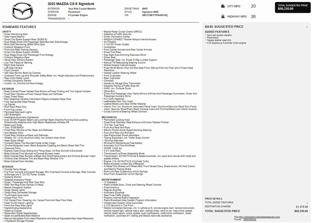 2nd Row Captain Chairs, 1 Owner / Local Trade in, Certified Pre Owned, CX-9 Signature, AWD, AppLink/Apple CarPlay and Android Auto, Auto High-beam Headlights, Heads-Up Display, Heated rear seats, Heated steering wheel, Heated/Ventilated Front Bucket Seats, Memory seat, Nappa Leather Seat Trim, Navigation System, Power driver seat, Power Liftgate, Power moonroof, Rain sensing wipers, Wheels: 20" x 8.5J Aluminum Alloy.