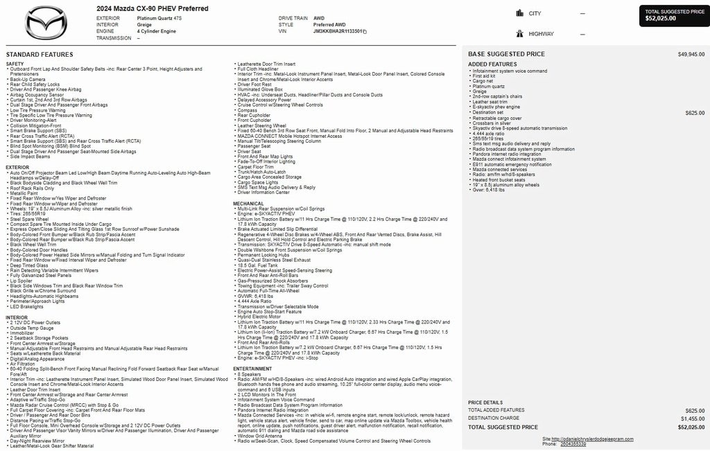 1 Owner, Certified Pre Owned, Locally owned Off Lease, CX-90 PHEV Preferred, AWD, 2nd-Row Captain's Chairs, AppLink/Apple CarPlay and Android Auto, Auto High-beam Headlights, Exterior Parking Camera Rear, Heated Front Bucket Seats, Leather Seat Trim, Power driver seat, Power Liftgate, Power moonroof, Rain sensing wipers, Wheels: 19" x 8.5J Aluminum Alloy.
